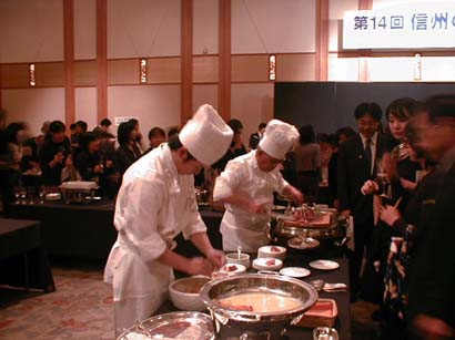 | 料理は和風ピラフ、パスタ、鶏肉などいろいろです。写真はこの試飲会名物のローストビーフを切り分けているところです。 |